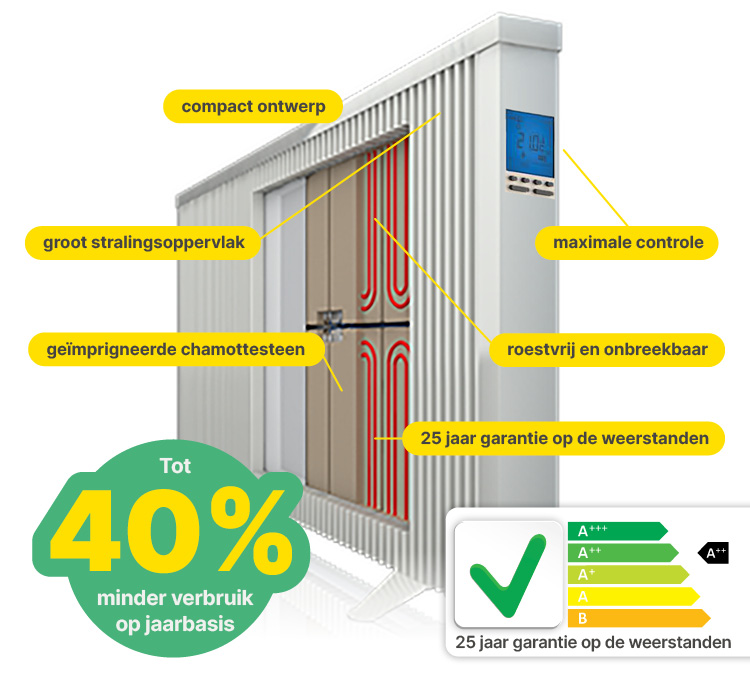 Door het uitgekiende ontwerp zijn de Elkatherm radiatoren tot 40% efficiënter dan klassieke accumulatoren. We buigen de wetten van de fysica niet om maar door een moderner toestel efficiënter in te zetten kan je met minder elektriciteitsverbruik hetzelfde comfort bekomen.